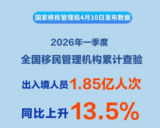 国家移民管理局4月10日发布2026年一季度移民管理主要数据。一季度,全国移民管理机构累计查验出入境人员1.85亿人次,同比上升13.5%。其中内地(大陆)居民9166.2万人次、港澳台居民7249.1万人次、外国人2133.3万人次,同比分别上升14.2%、10.3%、22.3%。免签入境外国人占入境外国人的77.9%。