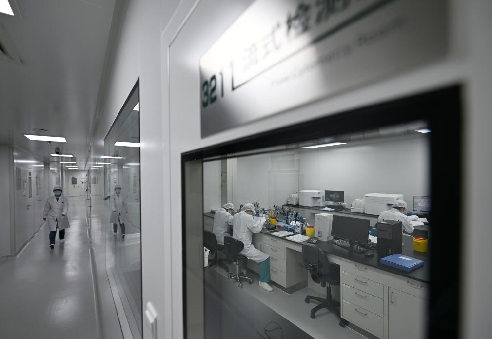 3月21日,合源生物科技(天津)有限公司工作人员在生产基地的检测室进行检测。新华社记者 赵子硕 摄