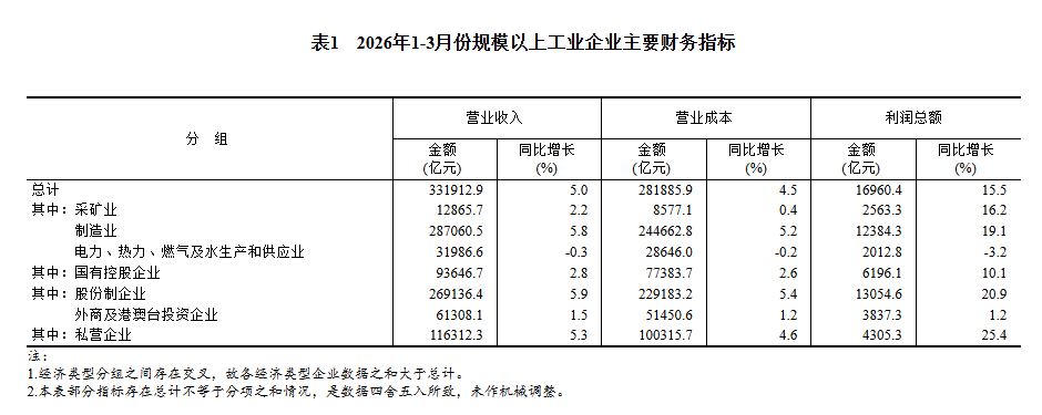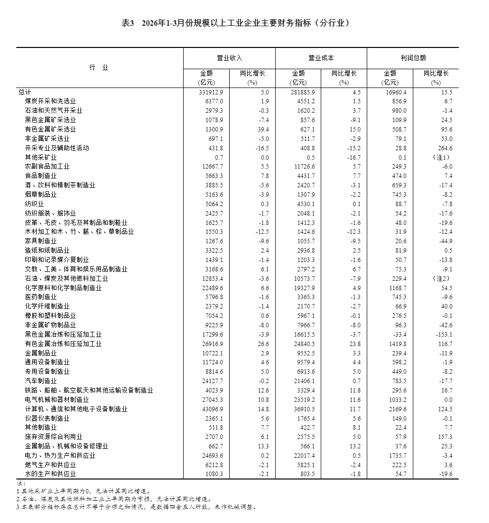 1—3月份,全国规模以上工业企业实现利润总额16960.4亿元,同比增长15.5%(按可比口径计算,详见附注二)。