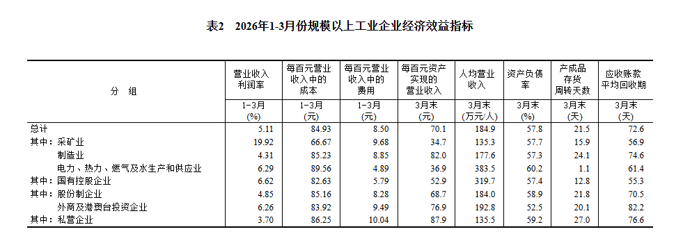 3月末,规模以上工业企业每百元资产实现的营业收入为70.1元,同比减少0.2元;人均营业收入为184.9万元,同比增加10.5万元;产成品存货周转天数为21.5天,同比增加0.3天;应收账款平均回收期为72.6天,同比增加1.3天。