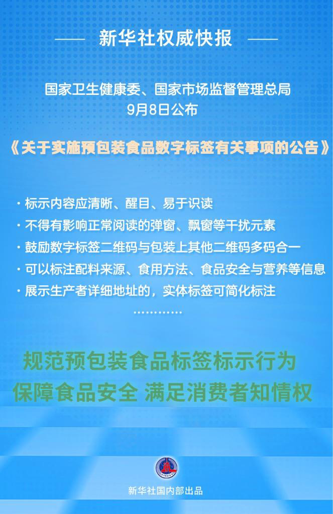 9月8日,国家卫生健康委、国家市场监督管理总局联合发布《关于实施预包装食品数字标签有关事项的公告》,我国预包装食品标签管理正式迈入数字化新阶段。